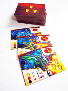 Et c’est ici que le mécanisme d’enchères prend de la profondeur. Puisqu’à cet instant, on s’intéresse à la couleur majoritairement présente parmi les cartes révélées, et on applique le déplacement du dragon tel qu’indiqué sur la tuile. Le joueur devant lequel un dragon arrête son déplacement, est alors brûlé par ce dernier… sauf si ce joueur est celui venant de réussir à faire pleurer le dragon ! Lorsque toutes les cartes de la Horde ont été jouées, la partie s’arrête et le joueur avec le moins de brûlures non soignées l’emporte !