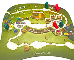 Dans cette extension, il y a plusieurs petits modules qui peuvent être joués en même temps ou ajoutés à notre bon vouloir. Une fois n’est pas coutume, cette extension propose 2 nouvelles créatures (ouvriers) de base, à savoir les cardinals et les grenouilles, et une extension de plateau supplémentaire qui se fixera sur la partie haute du plateau de base. Ce plateau apportera 2 nouveaux lieux, dont 1 qui se veut être un événement basique supplémentaire appelé « festival de fleurs ». Le 2ème est le marché ou nous allons pouvoir récupérer des ressources ou les échanger contre des points de victoire et des ressources de notre choix. Des tuiles objectifs de fin de parties ont été par ailleurs rajoutées pour permettre de scorer encore quelques points supplémentaires en fonction du défi proposé par le roi et la reine (par exemple : celui qui aura le plus de créatures dans son village gagnera x points de victoire).