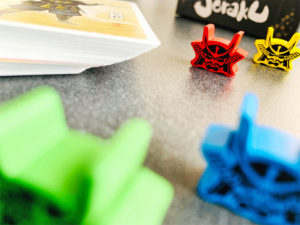 Au maniement du sabre, et donc aux commandes du titre, on retrouve Iori Tsukinami. Un auteur japonais qui n’est pas spécialement connu dans nos vertes contrées et qui publie avec Joraku, son quatrième jeu. L’opus, dont les parties sont accessibles à partir de douze ans, propose entre 30 et 60 minutes de jeu pour trois à quatre joueurs. Oui, ni plus ni moins même si cela peut paraître un peu sélectif.