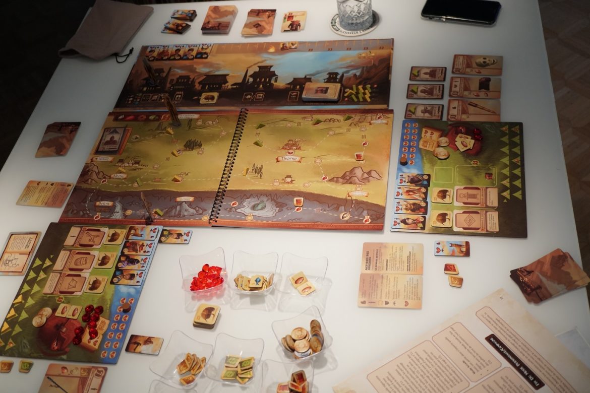 Après Above and Below, l’auteur Ryan Laukat propose Near and Far. Un jeu d’aventure narratif, pour 2 à 4 joueurs avisés. Dans cet opus, chacun recherche la Dernière Ruine, en jouant soit une partie rapide, soit des campagnes successives. A chaque tour, les aventuriers parcourent la ville pour recruter des compagnons, récupérer des vivres, de l’or, des objets ou même engager des oiseaux-porteurs et des tortues pour transporter leurs trésors. Quand ils le souhaitent, les joueurs peuvent partir à l’aventure sur l’une des douze map du jeu. En parcourant la carte, ils doivent faire face à des menaces, construire des routes commerciales et des campements ou effectuer des rencontres. Chaque rencontre déclenche des éléments narratifs contenus dans un livre d’histoires de plus d’une centaine de pages. Entre quêtes successives, rencontres atypiques et traquenards insoupçonnés, il y aura de quoi se laisser surprendre. Le premier joueur qui établit tous ses campements déclenche la fin de partie et les points de victoire sont alors comptabilisés. Un matériel bien produit et des illustrations très engageantes; c’est sûr le jeu donne clairement envie. Le tour de jeu n’est pas compliqué mais la règle comporte de nombreuses petites particularités. Ainsi, Near and Far s’adresse plutôt à des joueurs confirmés. Dans ce jeu, on retrouve d’excellents mécanismes de placements d’ouvriers, de gestion de ressources et de gestion de main de cartes. Le gameplay a été gratiné aux petits oignons et on retrouve bien la patte de l’auteur. L’énorme livret de rencontres et la surabondance des composants assure un bon renouvellement du jeu. Surtout si celui-ci est joué en mode campagne, en effectuant des quêtes. Convivialité et bonne humeur s’invitent rapidement autour de la table même si le jeu requiert tout de même une réflexion en matière de planification. Au final, le jeu plaît par une originalité omniprésente et par des mécanismes travaillés. L’Aventure narrative signée Ryan Laukat, on adore !