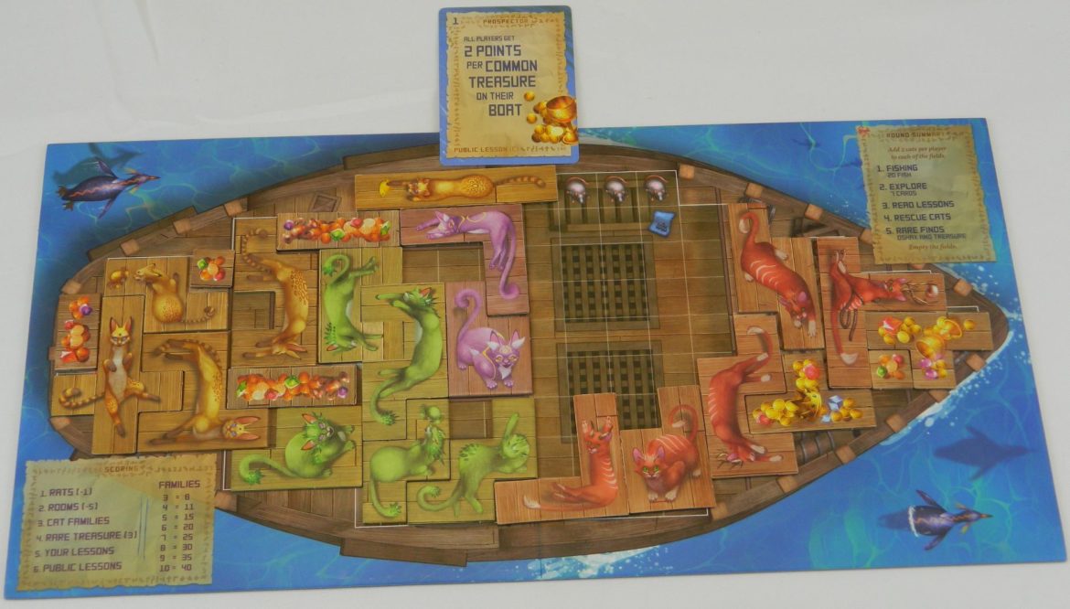 S’ensuit la phase de sauvetage des félins : chaque joueur prend à tour de rôle une tuile chat (qu’il amadoue avec du poisson) pour le placer directement sur son bateau, à condition que la tuile nouvellement placée touche une autre, tout en rassemblant les familles de couleur et ce, autant de fois que vous le souhaitez. A vous de trouver le bon équilibre entre le nombre de cartes et de chats à sauver ! Des trésors et des chats jokers vous attendent aussi pour agrémenter votre mission de sauvetage et… accessoirement gagner des points supplémentaires !